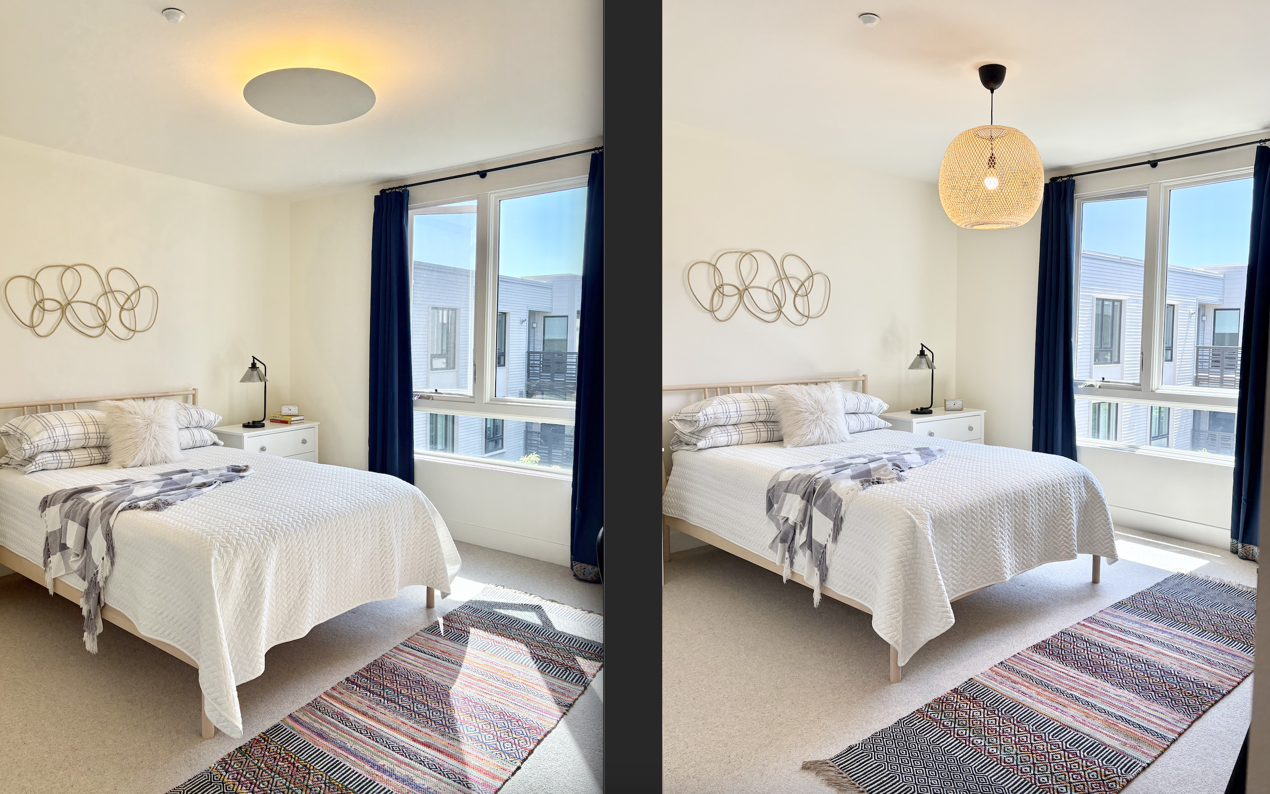 Ultimately, I took a trip to IKEA (my “adult Disneyland”) and walked away with the 20” Vindöga – a bamboo sphere light fixture – for the primary bedroom. A full-fledged chandelier would risk head-bonking, while a modest flush mount (like in the flex space and second bedroom) would be too small. I also didn’t want to get anything overly feminine (even though I love those kinds of pretty lights), as I anticipate that we’ll be moving my son into this bedroom sometime in the next several years, and we wouldn’t want to mar his adolescence by forcing a “girl light” on him. So a casual woven light seemed a reasonable compromise, plus it was on sale for $75, which was hard to resist. (West Elm retails a very similar “wicker globe pendant” for $399! What?!) The old light fixture was just so blah, being a white circle on a white ceiling in a white room, but the Vindöga subtly pops in this otherwise very neutral bedroom (Exhibit B).
