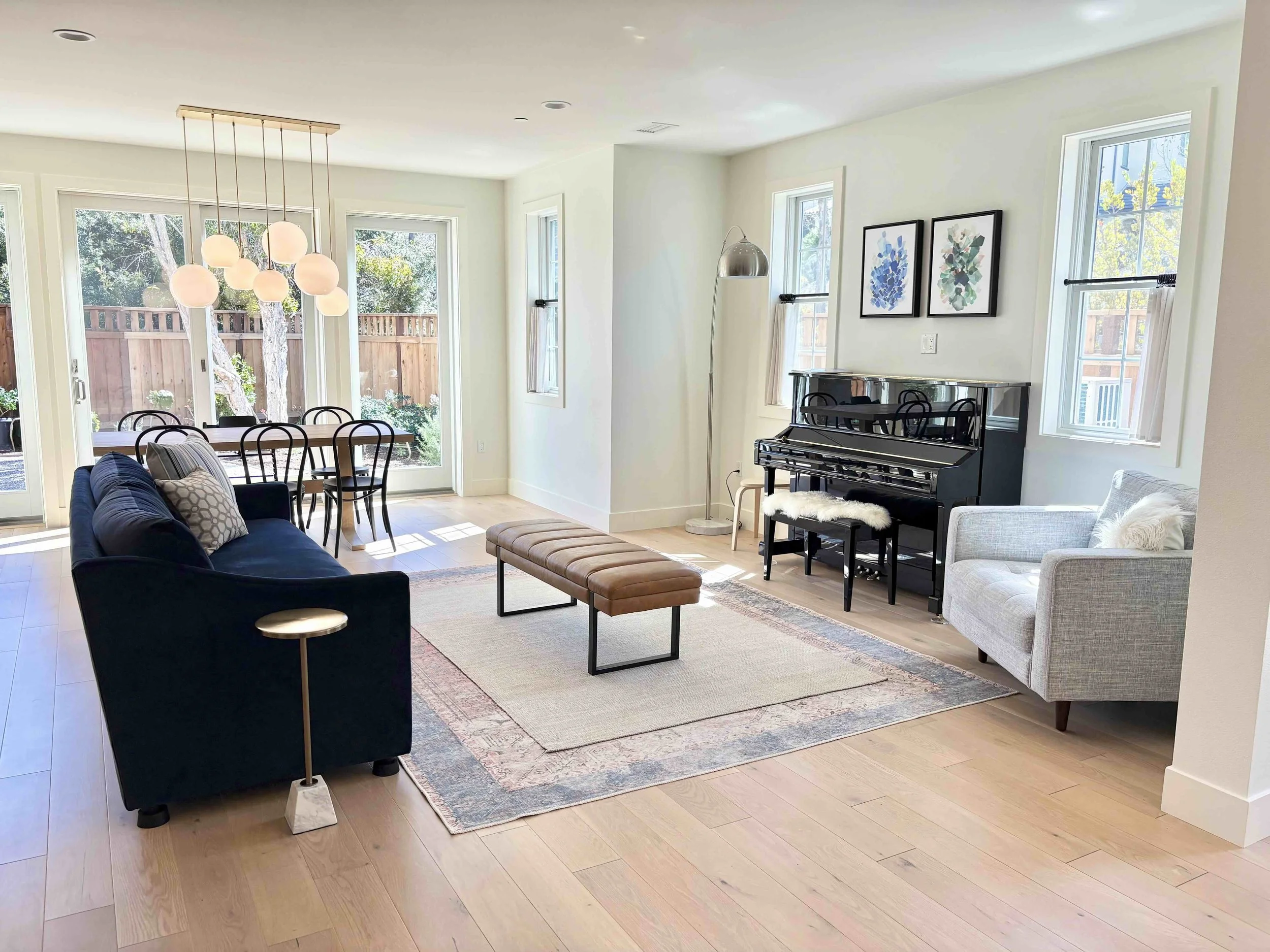 Our downstairs is basically one big open floor plan, but I’ll talk about the living room for now. The furniture arrangement was easy to figure out, as we have an upright piano that only makes sense in one spot, so that determined the layout of the entire room. This is almost identical to our condo living room; even the size of the rugs was well-suited to this space, so I was able to basically “lift and shift” our former living room into this one. There is one major change, though: we got a new couch! Our previous couch has been moved upstairs (explained in Primary Bedroom and Bath), so we needed to replace it with something similarly sized. We’ve liked Article for our sofas in the past, so now we have their Landry couch (in a deep blue synthetic velvet) joining our Sven armchair, holding court in the living room. In an ideal world, perhaps I would’ve waited two more years before buying a new couch, as our kids are still apt to deposit bodily fluids on it (e.g., drool, tears, occasional potty accidents), but that’s why I went with a dark color and easily cleaned fabric. In the past, I’ve been very conservative with the color of my couches, opting for only grays and beiges (I would like something lighter, but can’t risk it with little kids). This time, I decided to go bold with blue (apparently a theme in my home), which I basically use as a neutral color in design. A solid, dark piece of furniture like this takes up a lot of visual space (especially since this couch is blocky and not “leggy”), so it’s not something I would suggest for a smaller house, but this room can handle it. We have so much extra square footage in here that I’m happy to have any excuse to make it appear filled up, but without actually adding anything to the room. That’s one of my minimalist decorating tactics!